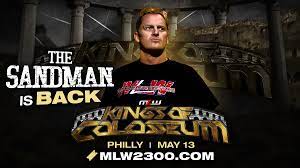La empresa norteamericana Mejor League Wrestling mediante un comunicado anunció la participación de la leyenda extrema de la lucha, The Sandman, quien estará presente para la función Kings of Colosseum el próximo 13 de mayo en el 2300 Arena de Philadelphia.