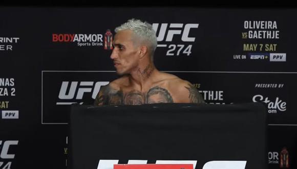 Durante el pesaje oficial esta mañana en la sede del UFC 274, Justin Gaethje dio el peso sin problema, pero el campeón de peso ligero Charles Oliveira, falló en dos ocasiones, a pesar de darle tiempo para dar el peso, no logró conseguirlo, siendo despojado del título. Según las reglas unificadas de las MMA, Oliveira enfrentará a Gaethje tal como se había acordado; pero no podrá retener el cinturón, solo Justin podrá convertirse en nuevo monarca si es que vence a Oliveira, de ganarlo Charles, el título queda vacante.