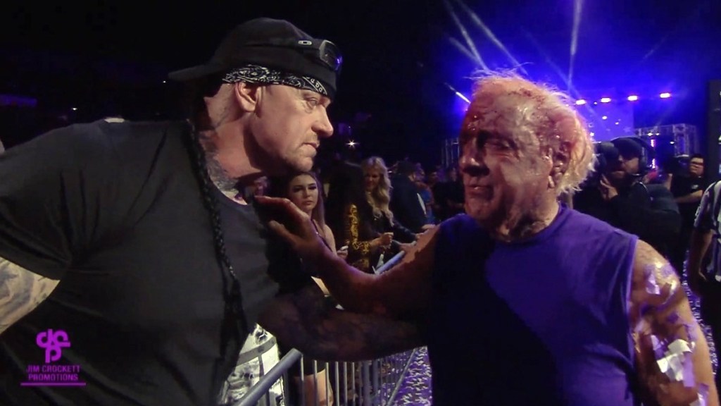 Ya en el combate, el ícono se asoció con Andrade El Idolo para vencer a Jay Lethal y Jeff Jarrett, marcó el final de casi cinco décadas de lucha libre profesional para Nature Boy. Su rostro estaba cubierto de sangre mientras luchaba por última vez. Lanzó algunas chuletas y gritó ‘wooo’ varias veces antes de finalmente salir como ganador.