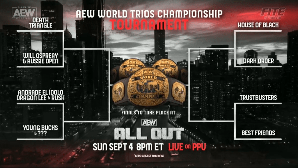 Durante la última edición de AEW Dynamite: Quake by the Lake, Jim Ross, Excalibur y Tony Schiavone anunciaron las llaves de las tercias que compondrán el torneo por el campeonato de tercias de AEW. Esas tercias son las siguientes: