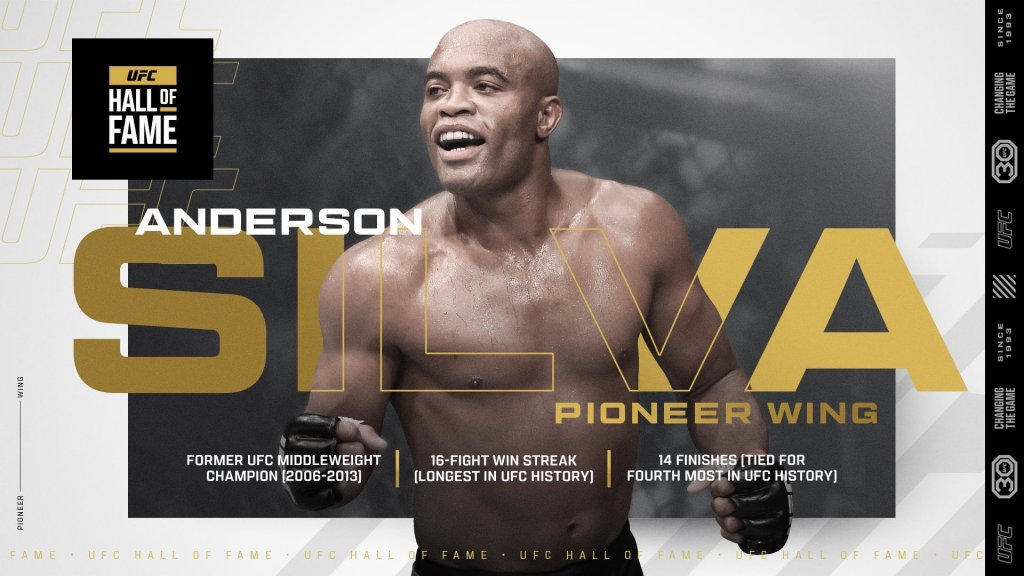 “Anderson Silva es uno de los mejores atletas de todos los tiempos”, dijo el presidente de UFC, Dana White. “La racha ganadora de 16 peleas de Anderson en UFC, 10 defensas exitosas del título y casi siete años como campeón de peso mediano fueron una de las cosas más notables que hemos visto en los deportes profesionales. Era un artista dentro del Octágono, y será un honor nombrarlo al Salón de la Fama de UFC”.